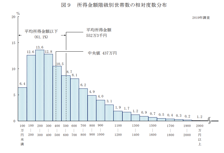 以下は「厚生労働省2020年家計調査」から引用したグラフですが、年収の中央値は437万円と