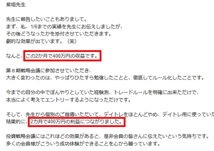 「第8期に参加し、2カ月で400万円の収益です。劇的な効果が出ています」