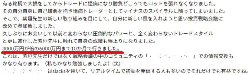 10カ月で3000万の資金を2倍の6000万円に増やされました。