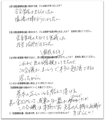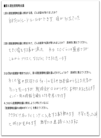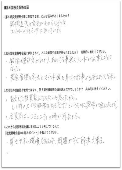 「このままでは全財産を失ってしまう」という恐怖感から、本格的に株式投資をはじめようと考え、僕のところに辿り着き、当時の「第5期投資戦略会議」に参加されました。